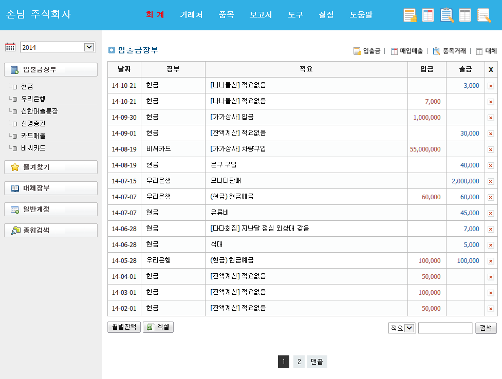 현금 및 예금시제, 신용카드 매입매출, 계좌간 이체 같은 일반적인 자금관리 부터 거래처 외상관리, 대체전표 처리까지